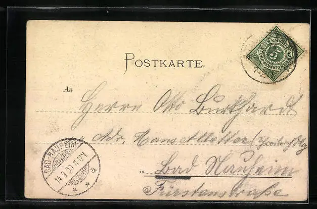 Personenbezogene Daten auf der Rückseite der Karte wurden durch blauen Textmarker unkenntlich gemacht. Die blauen Stellen sind auf die Vorderseite durchgeweicht und wirken sich negativ auf das Postkartenfoto aus