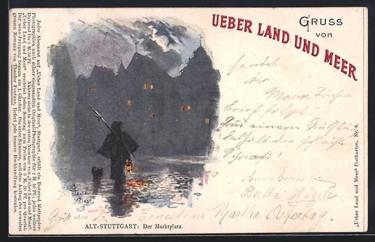 Künstler-AK Stuttgart, Nachtwächter am Marktplatz