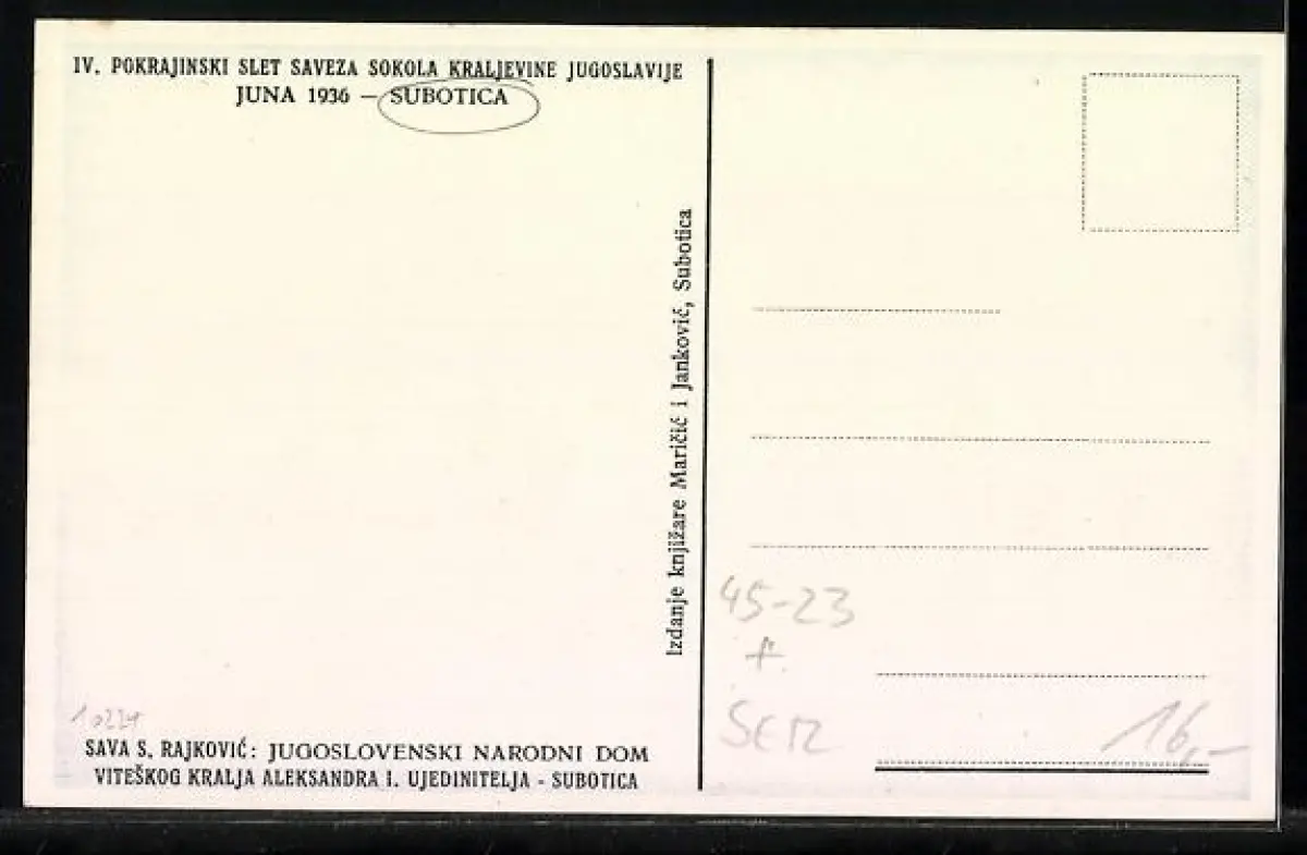 Künstler-AK Subotica, IV. Pokrajinski Slet Saveza Sokola Kraljevine Jugoslavje 1936