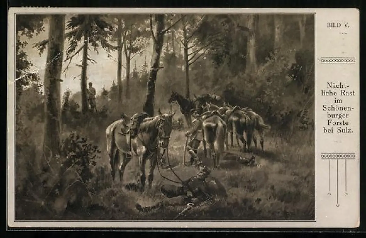 Künstler-AK Sulz, Soldaten bei der nächtlichen Rast im Schönenburger Forste