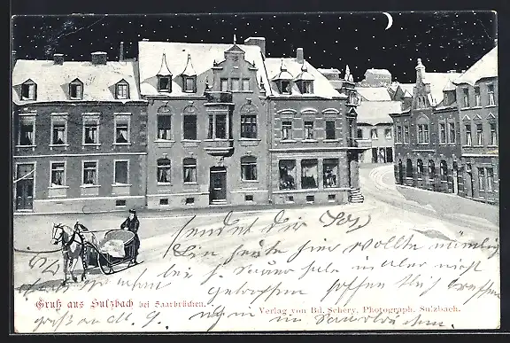 Künstler-AK Sulzbach / Saar, Nächtliche Ortspartie im Winter, mit Pferdeschlitten