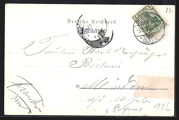 alte Ansichtskarte, gelaufen 1906, Eckknick oben re., Einriss re. Mitte, geklebter Einriss li. unten, rückseitig Klebe- und Papierreste