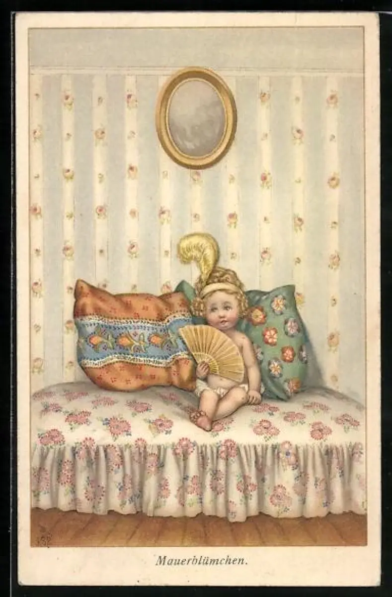 Künstler-AK Susan Beatrice Pearse: Mauerblümchen sitzt mit Fächer auf dem Bett
