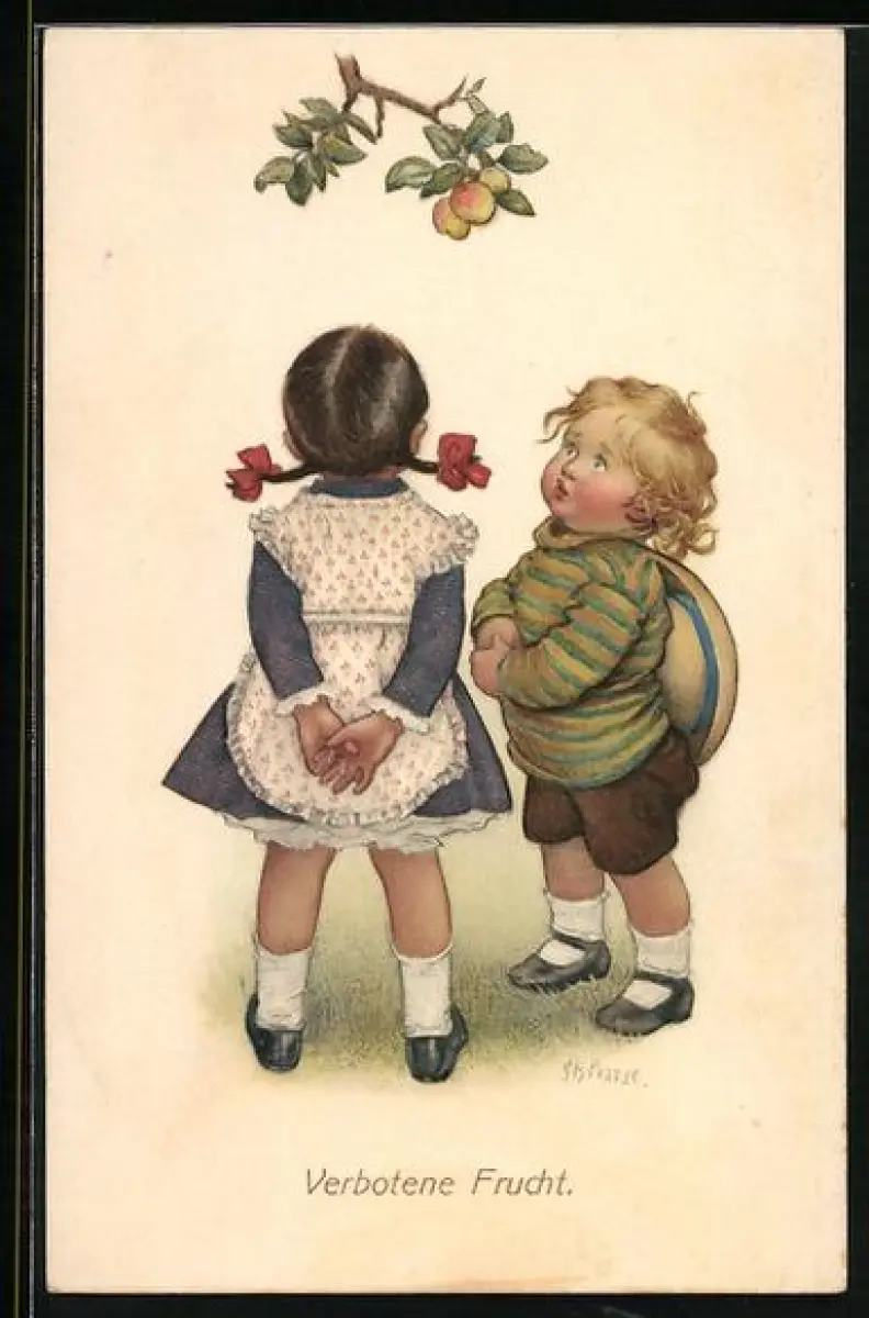 Künstler-AK Susan Beatrice Pearse: Verbotene Frucht, Kinder beobachten einen Apfel