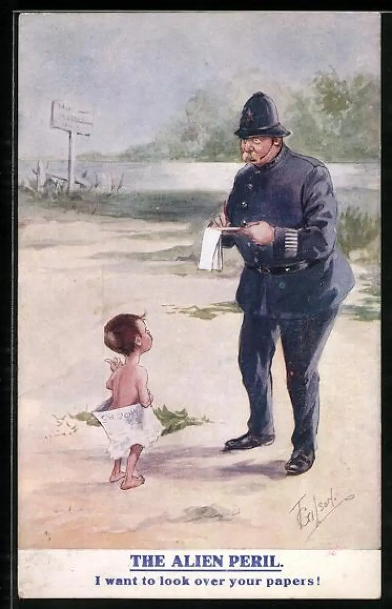 Künstler-AK T. Gilson: Polizist steht vor dem kleinen nackten Jungen und schreibt ihn auf