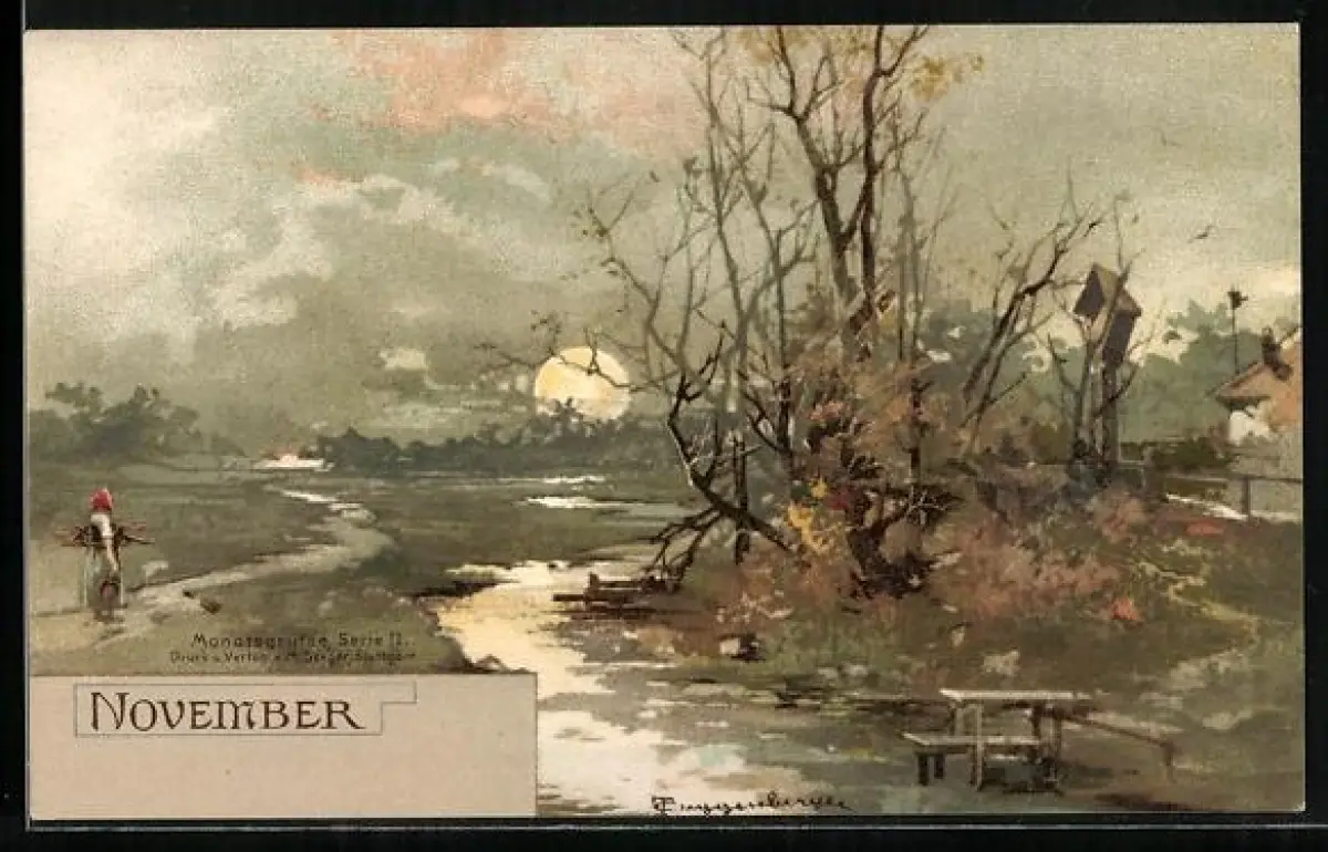 Künstler-AK T.Guggenberger: Monatsgrüsse Serie II, November, Herbstpartie, Frau vom Feld