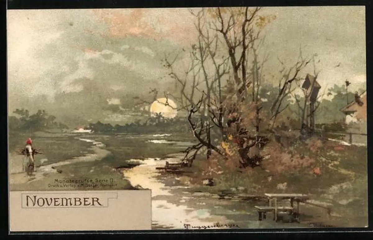 Künstler-AK T.Guggenberger: Monatsgrüsse Serie II, November, Herbstpartie, Frau vom Feld