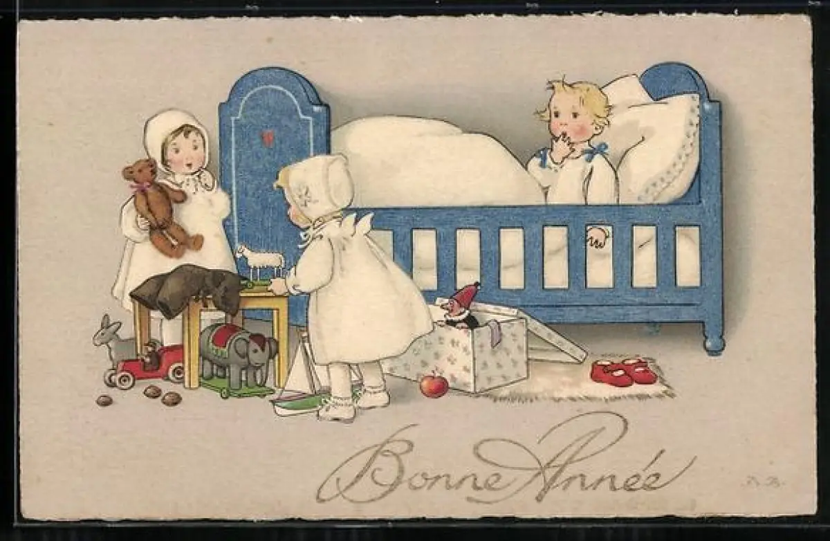 Künstler-AK Teddy, Kinder mit Spielsachen am Kinderbett, Weihnachtsgruss