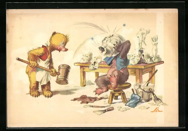 Künstler-AK Teddy beim Bildhauen im Atelier