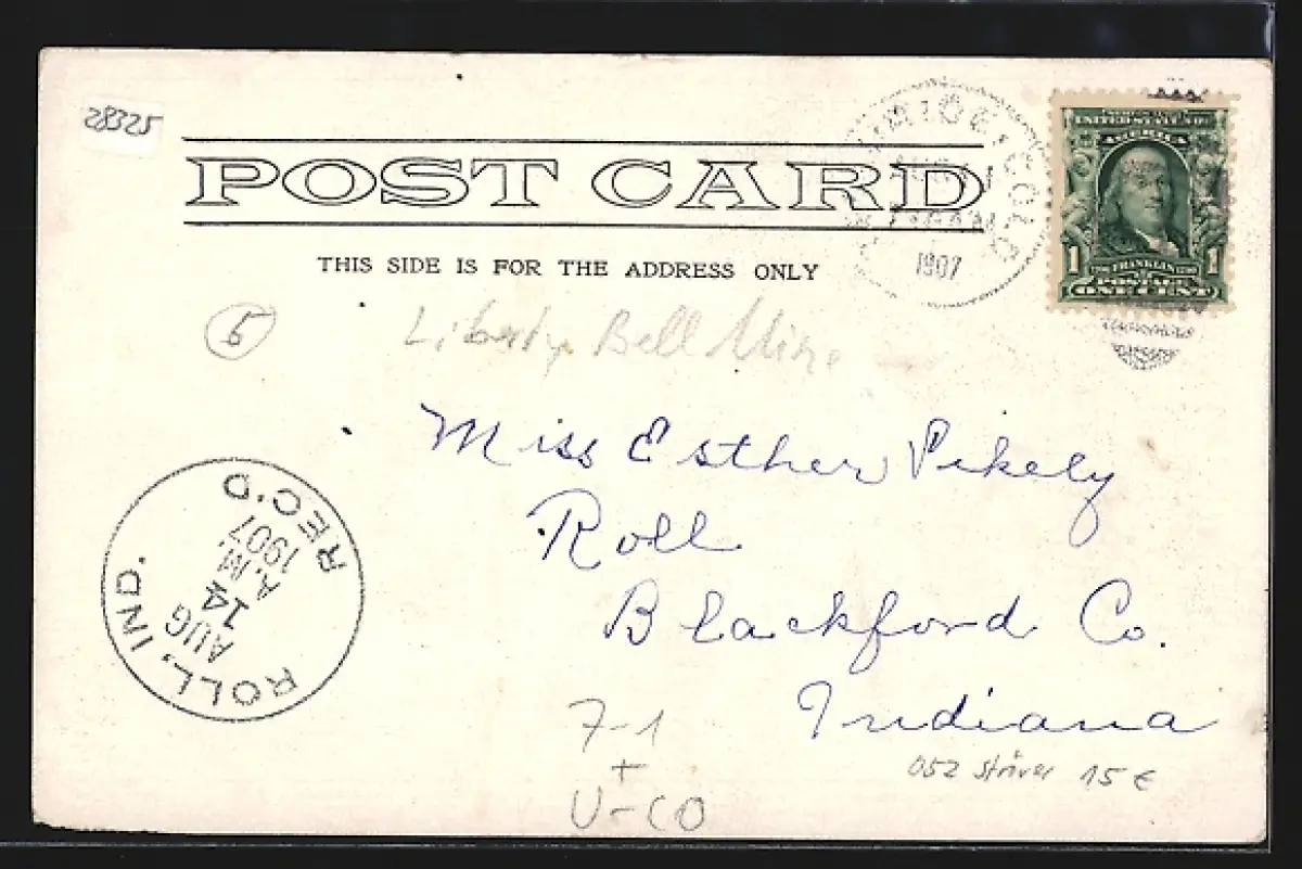 Personenbezogene Daten auf der Rückseite der Karte wurden durch blauen Textmarker unkenntlich gemacht. Die blauen Stellen sind auf die Vorderseite durchgeweicht und wirken sich negativ auf das Postkartenfoto aus