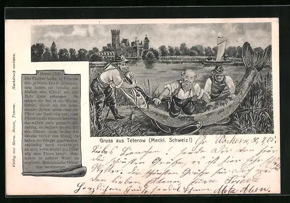 Künstler-AK Teterow /Meckl. Schweiz, Fischer mit einem riesigen Fisch