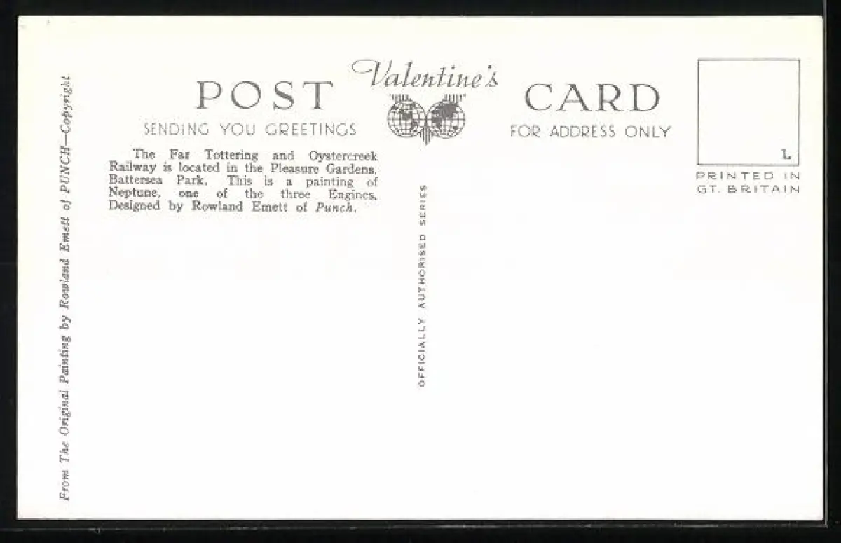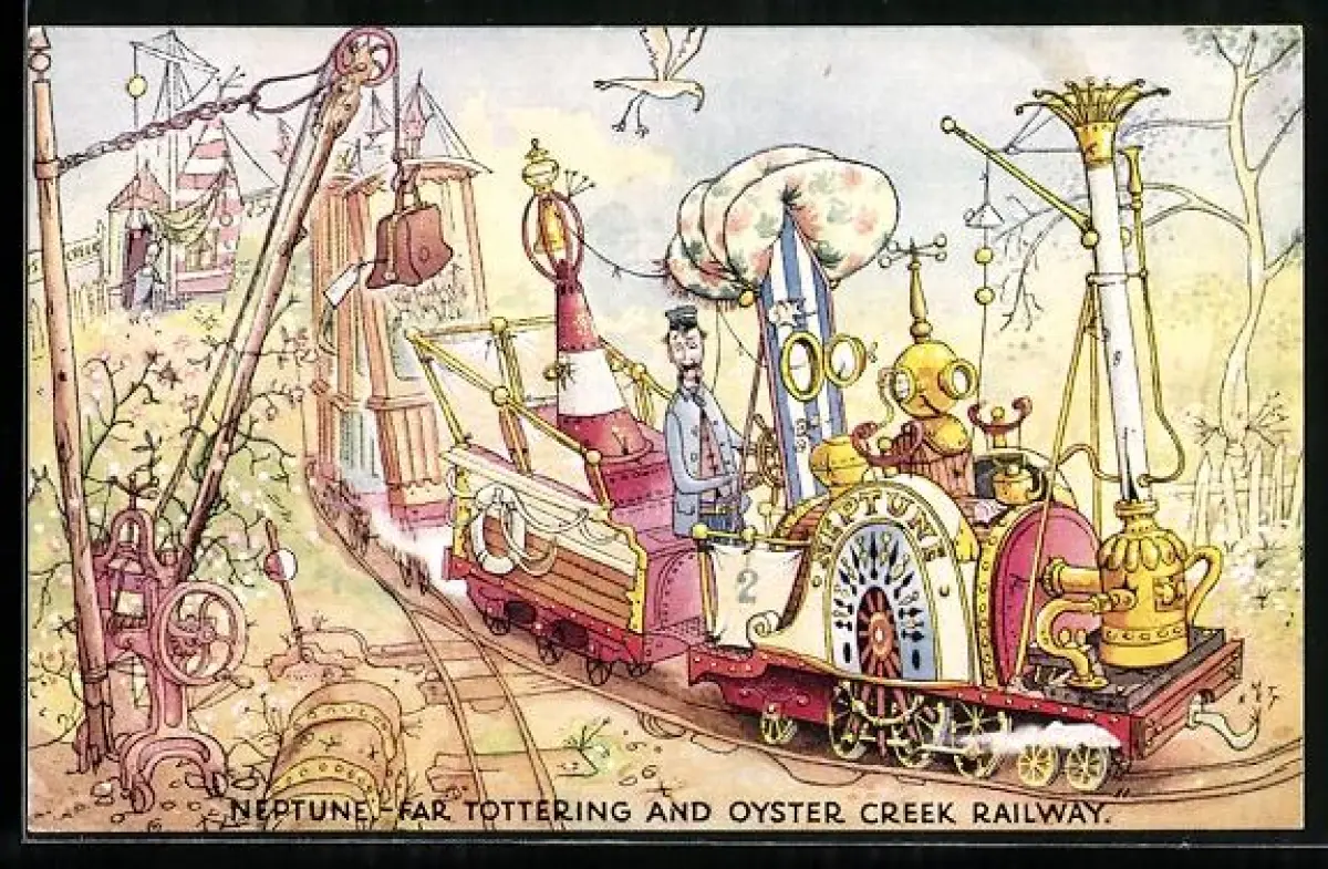 Künstler-AK The Far Tottering & Oyster Creek Railway in the Battersea Pleasure Gardens, engine Neptune