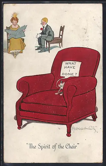 Künstler-AK The Spirit of the Chair, Sessel steht leer während Paar auf Holzstühlen sitzt