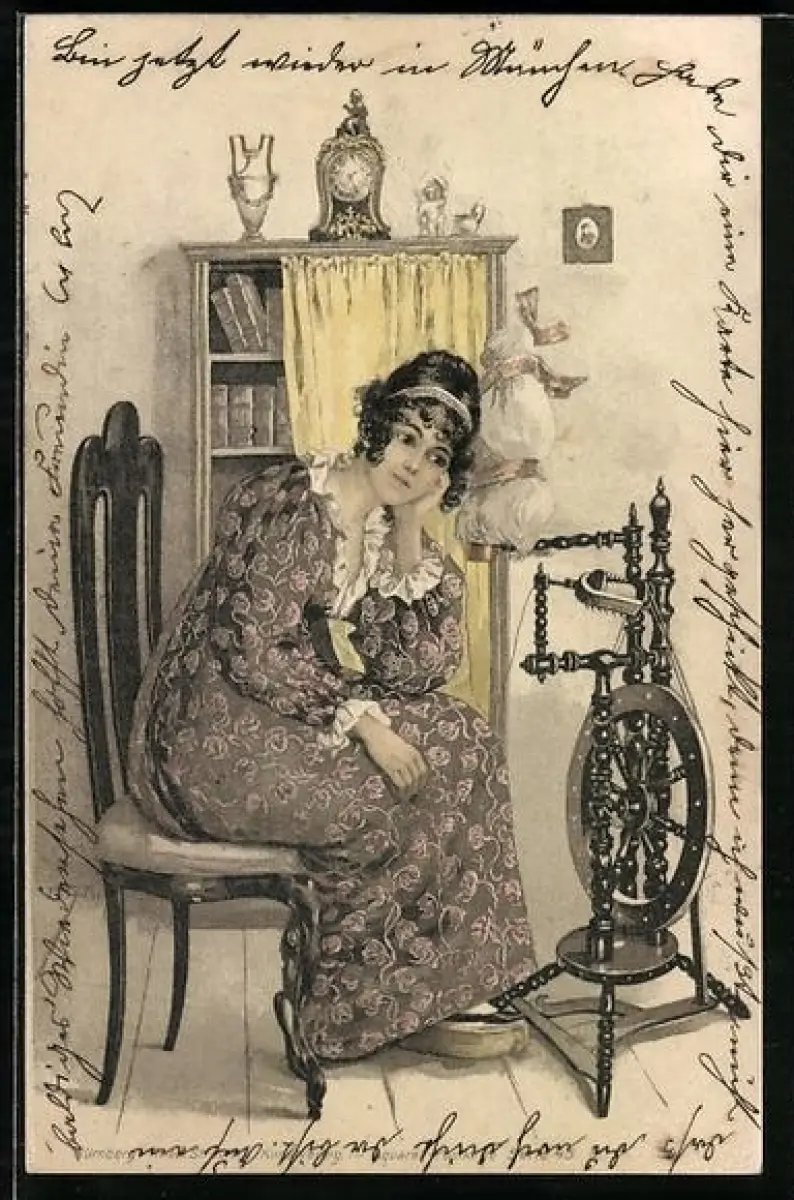 Künstler-AK Theo Stroefer: Frau sitzt nachdenklich vor ihrem Spinnrad