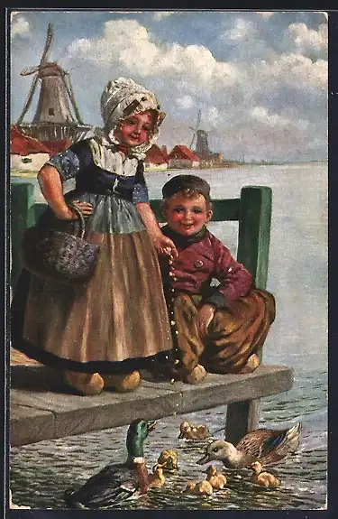 Künstler-AK Theo Stroefer Serie Nr. 894: Mädchen und Knabe füttern eine Entenfamilie