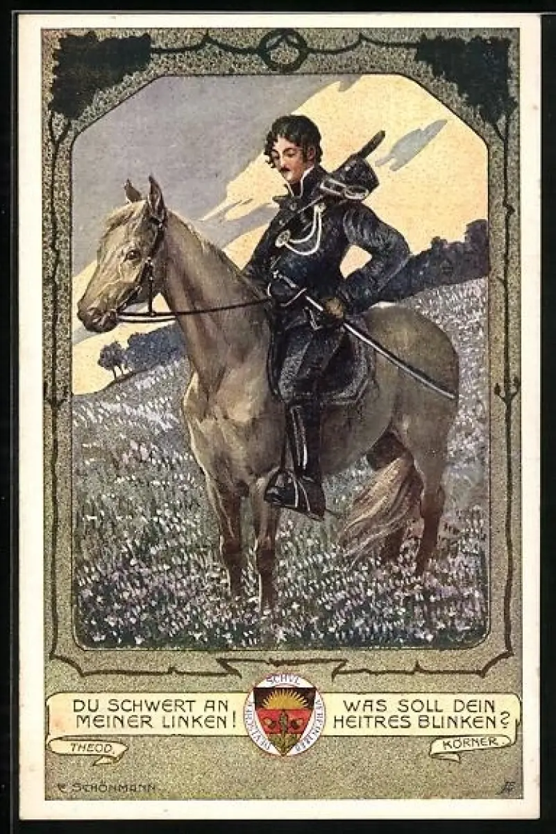 Künstler-AK Theod. Körner, Du Schwert an meiner Linken, Der Dichter zu Pferd dargestellt