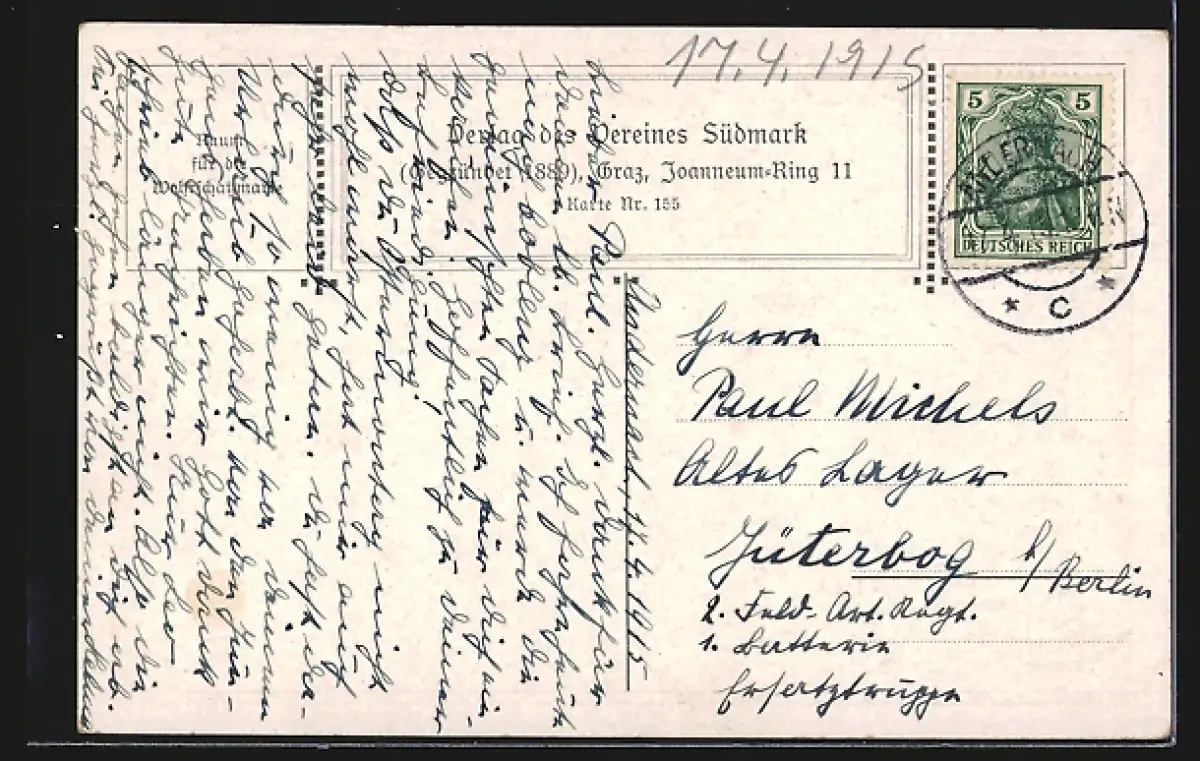 alte Ansichtskarte, gelaufen 1915, Bugspur links oben, guter Zustand
