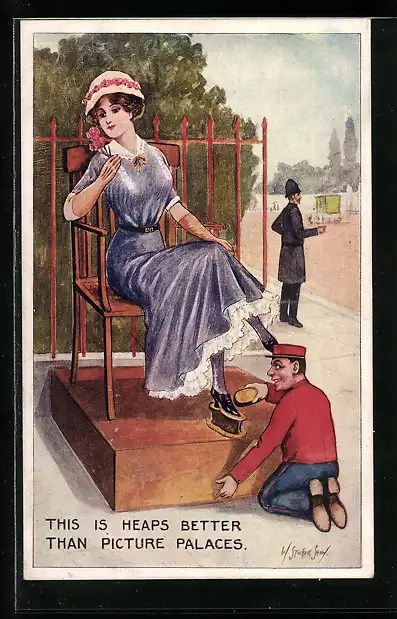 Künstler-AK This is heaps better than pircture palaces, Schuhputzer putzt einer Dame den Schuh