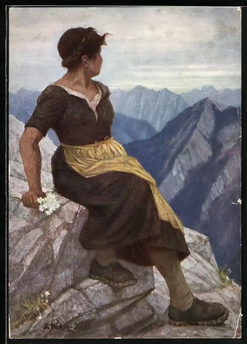Künstler-AK Thomas Walch: Frau im Kleid geniesst die Aussicht in den Bergen