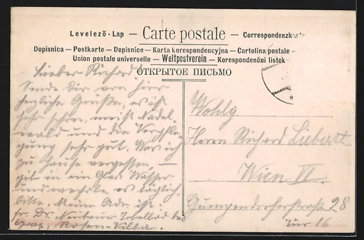 alte Ansichtskarte, gelaufen, Briefmarke entfernt, rückseitig Oberflächenschaden, guter Zustand