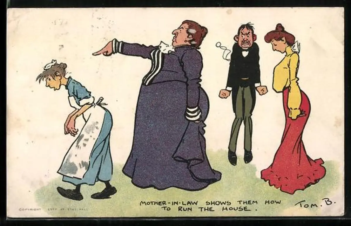 Künstler-AK Tom Browne: Dame kommandiert ein Dienstmädchen herum