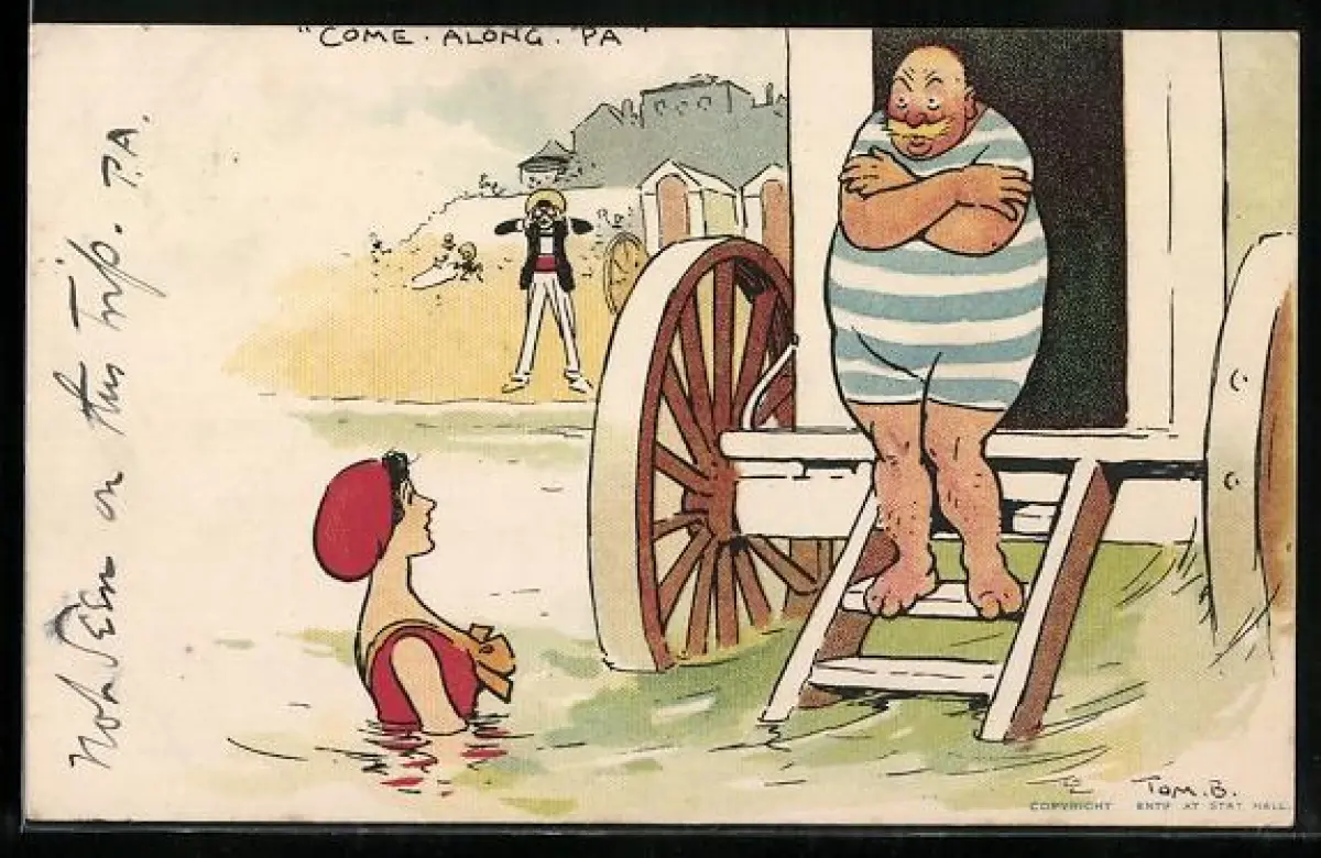 Künstler-AK Tom Browne: Mann im Badeanzug steigt aus einem Badekarren