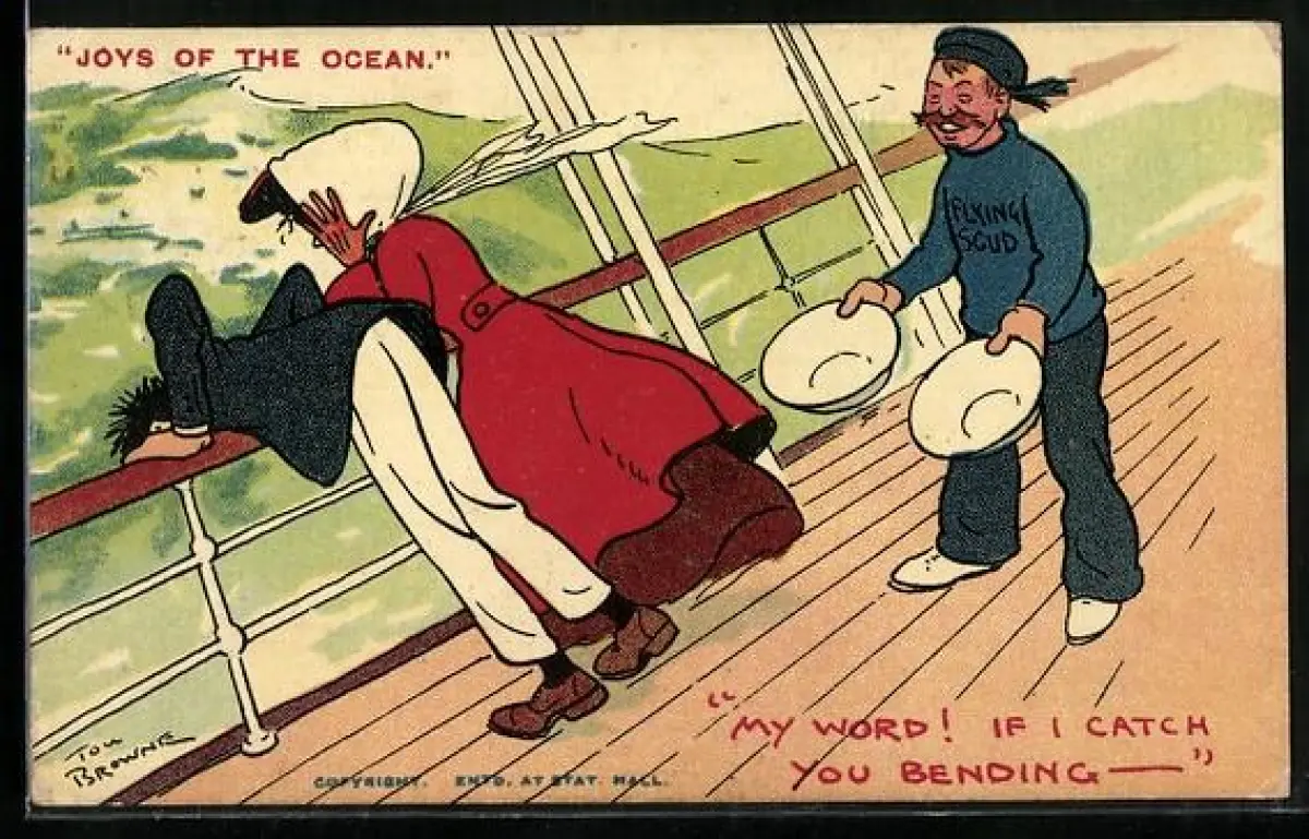 Künstler-AK Tom Browne: Passagiere übergeben sich über die Schiffsreling