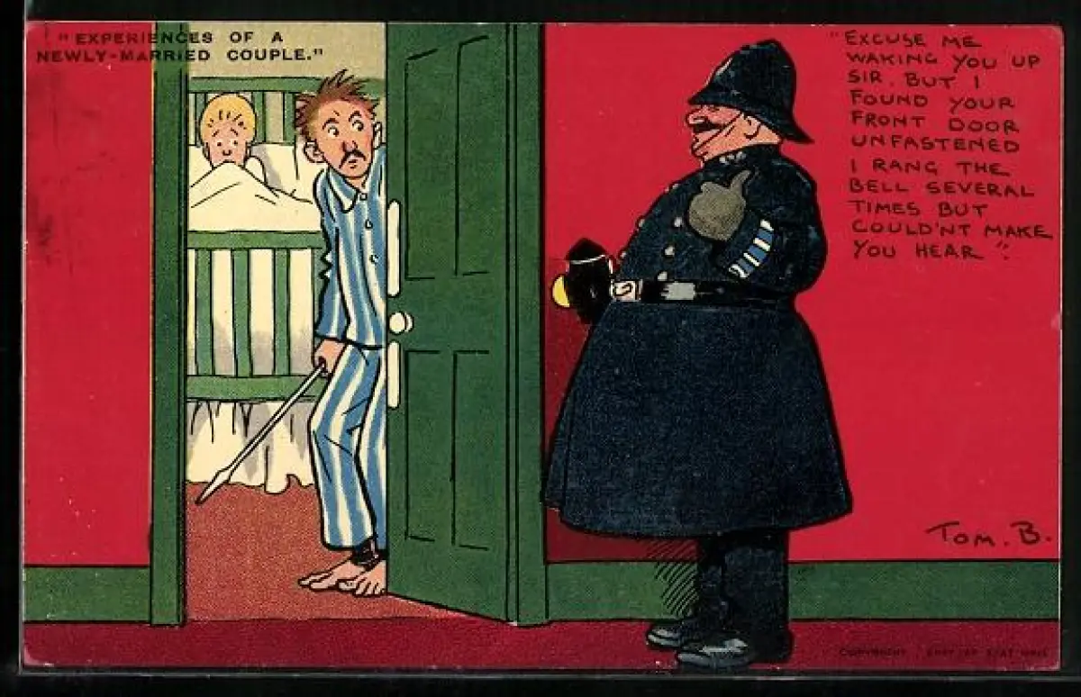 Künstler-AK Tom Browne: Polizist klingelt bei einem schlafenden Paar