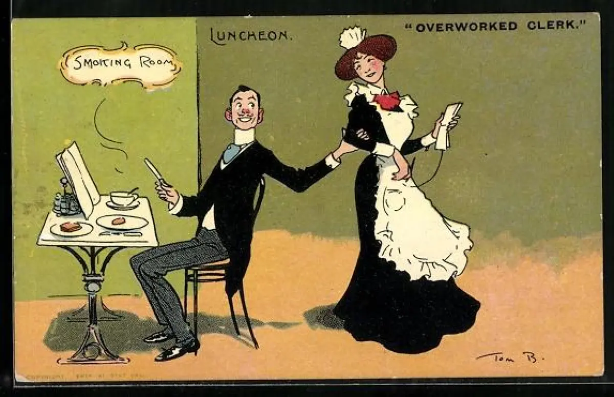 Künstler-AK Tom Browne: Restaurantgast flirtet mit einer Kellnerin