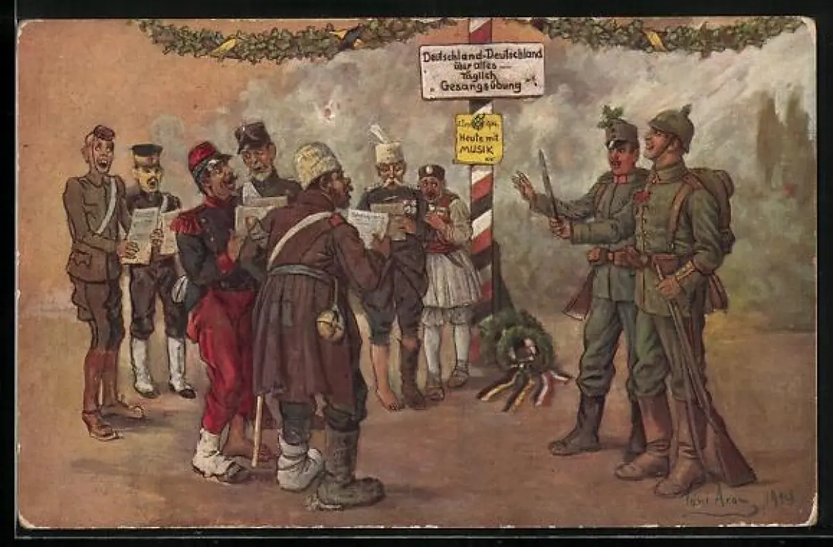 Künstler-AK Toni Aron: deutsche Soldaten in Uniform weisen Ausländer ab, Propaganda 1. Weltkrieg