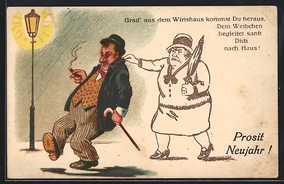 Künstler-AK Trinkerhumor, betrunkener Mann wird von seiner Frau am Kragen gepackt