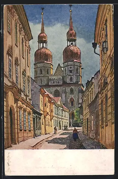 Künstler-AK Trnava, Strassenpartie mit Kirche