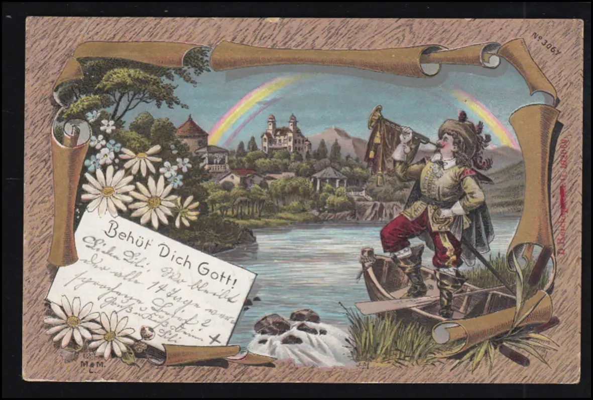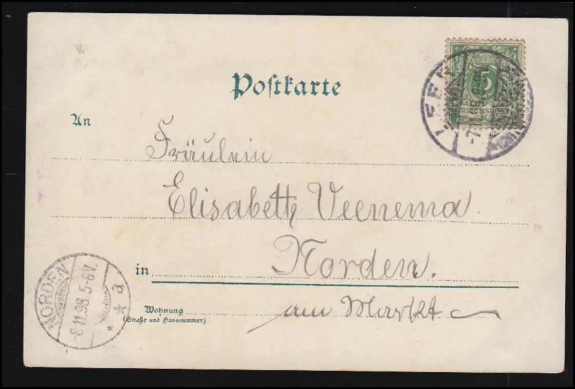 Künstler-AK Trompeter im Boot Stadt mit Regenbogen, LEER 7.11.1898 nach NORDEN