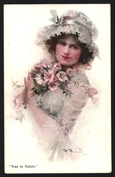 Künstler-AK True to Nature, Fräulein mit Haube und Blumen