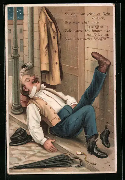 Künstler-AK Trunkenbold schläft am Rinnstein, Trinkerhumor