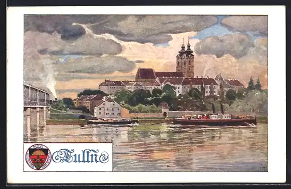 Künstler-AK Tulln, Ortspartie am Flussufer, Deutscher Schulverein