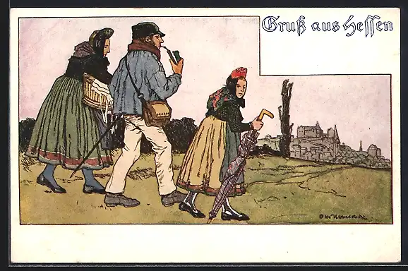 Künstler-AK Ubbelohde: Leute in hessischen Trachten, Schirm