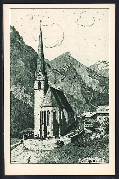 Künstler-AK Ulf Seidl: Heiligenblut, Ortschaft mit Kirche