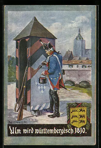 Künstler-AK Ulm, Ulm wird württembergisch 1810, Soldat mit Wappen