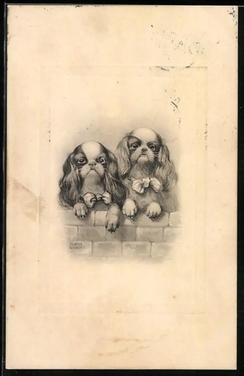 Künstler-AK Ulrich Weber: Zwei Hunde mit Schleifen blicken über eine Mauer