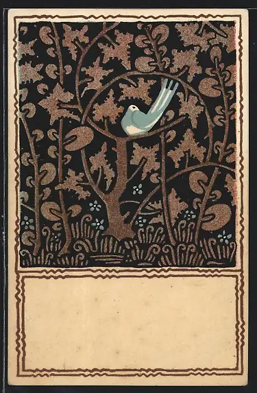 Künstler-AK Ungarische Werkstätte, Vogel in den Zweigen eines Baumes, Jugendstil
