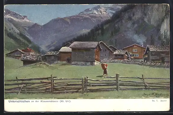 Künstler-AK Unterschächen, Hütten an der Klausenstrasse
