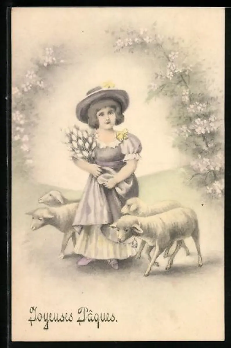 Künstler-AK V.K., Vienne Nr. 4023a: Fräulein mit Lämmern, Ostergruss