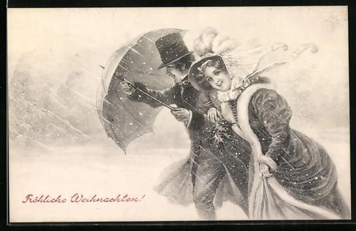 Künstler-AK V.K., Vienne Nr. 5001 /a: Bonne Année!, Mann und Frau laufen durch Wintersturm