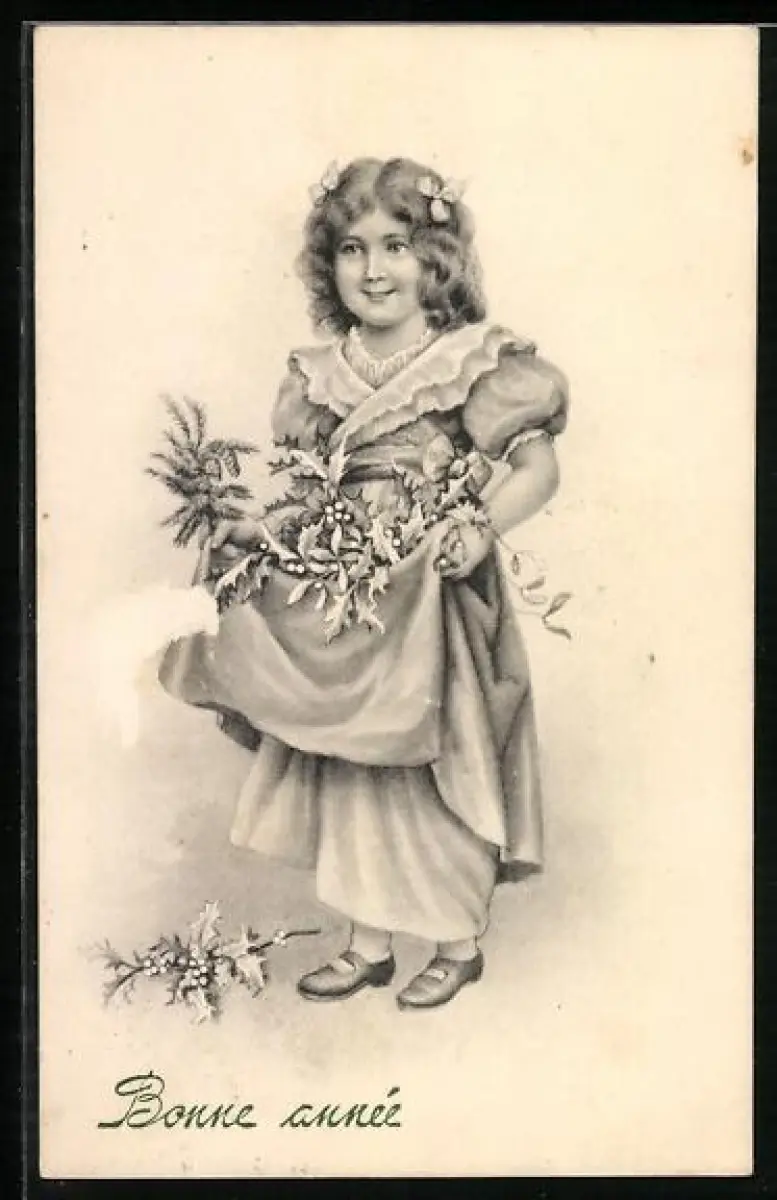 Künstler-AK V.K., Vienne Nr. 5055: Fräulein mit Mistelzweigen, Neujahrsgruss