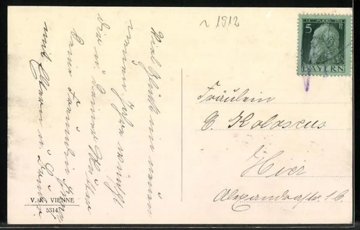 Personenbezogene Daten auf der Rückseite der Karte wurden durch blauen Textmarker unkenntlich gemacht. Die blauen Stellen sind auf die Vorderseite durchgeweicht und wirken sich negativ auf das Postkartenfoto aus