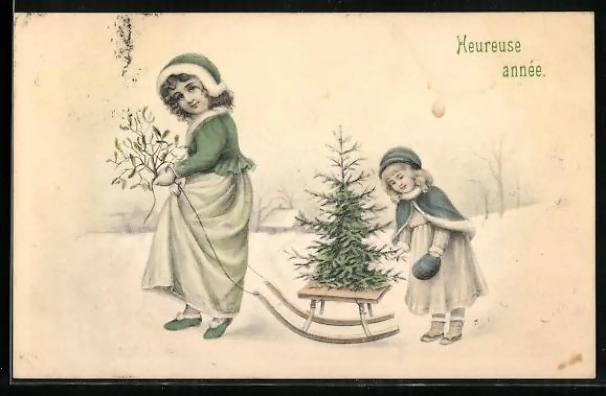 Künstler-AK V.K., Vienne Nr. 5504 /b: Junges Schwesternpaar beim Transport des Weihnachtsbaumes