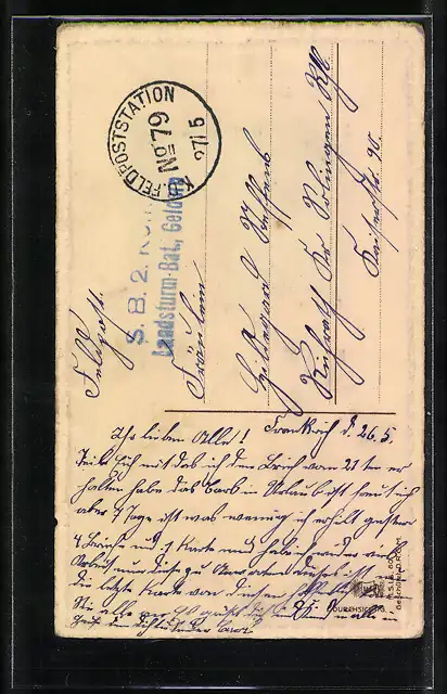 Personenbezogene Daten auf der Rückseite der Karte wurden durch blauen Textmarker unkenntlich gemacht. Die blauen Stellen sind auf die Vorderseite durchgeweicht und wirken sich negativ auf das Postkartenfoto aus