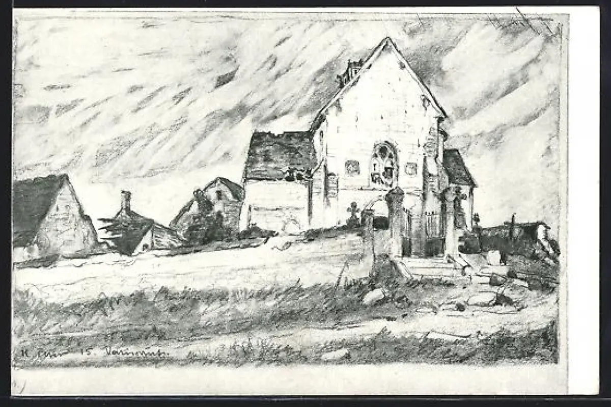 Künstler-AK Variscourt, Vue de l`église et des bâtiments environnants