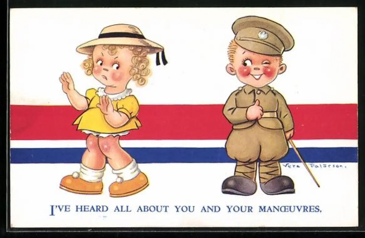 Künstler-AK Vera Paterson: Mädchen wendet sich wütend vom Knaben in Uniform ab